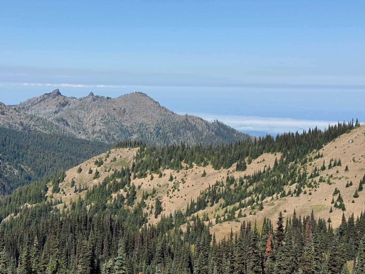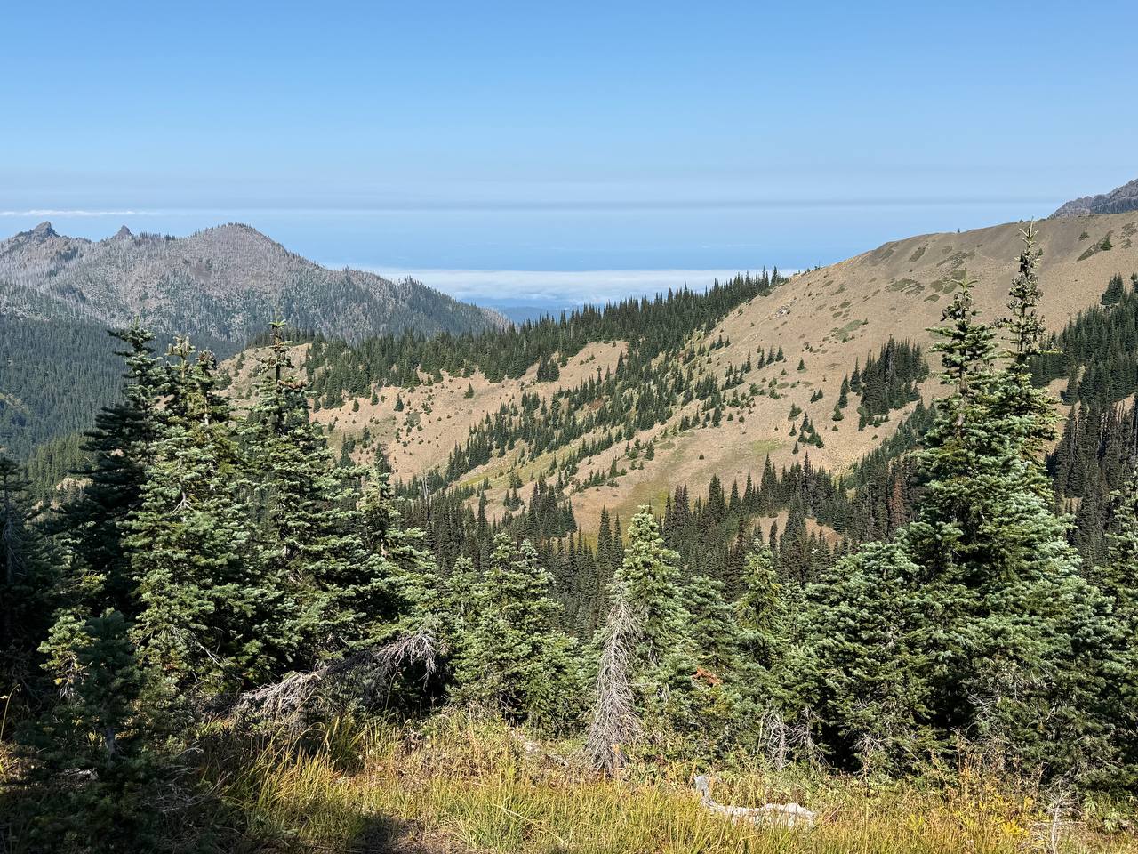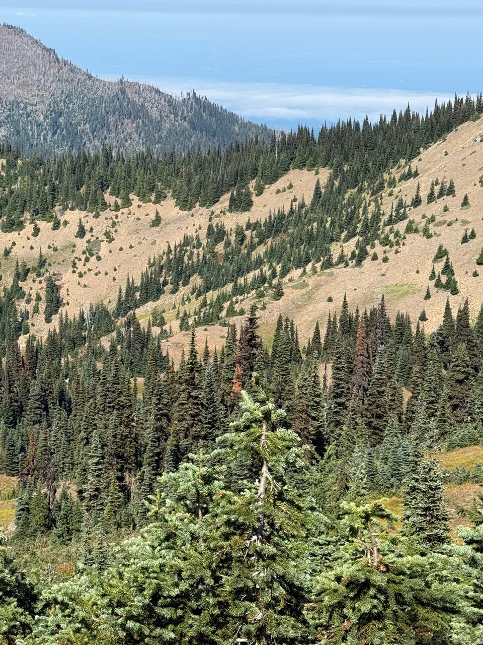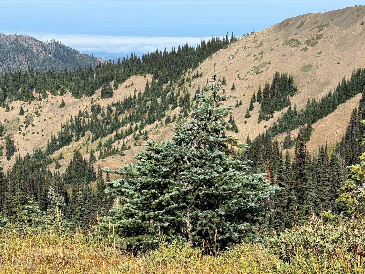 Перед нами северный горизонт. Голубая «полоса моря» внизу — это пролив Juan de Fuca, а за ним — Канада, остров Vancouver. В ясный день отсюда различима и столица Британской Колумбии — Victoria (она почти напротив Port Angeles, около 35 км по прямой), но сегодня город скрыт под сплошной белой «кромкой» — это морской туман/низкая слоистая облачность над водой (marine layer). Контраст «сухих» золотистых лугов на переднем плане и темной хвои ниже хорошо показывает ступени высотных поясов Олимпик: субальпийский луг → елово-пихтовый лес → море.