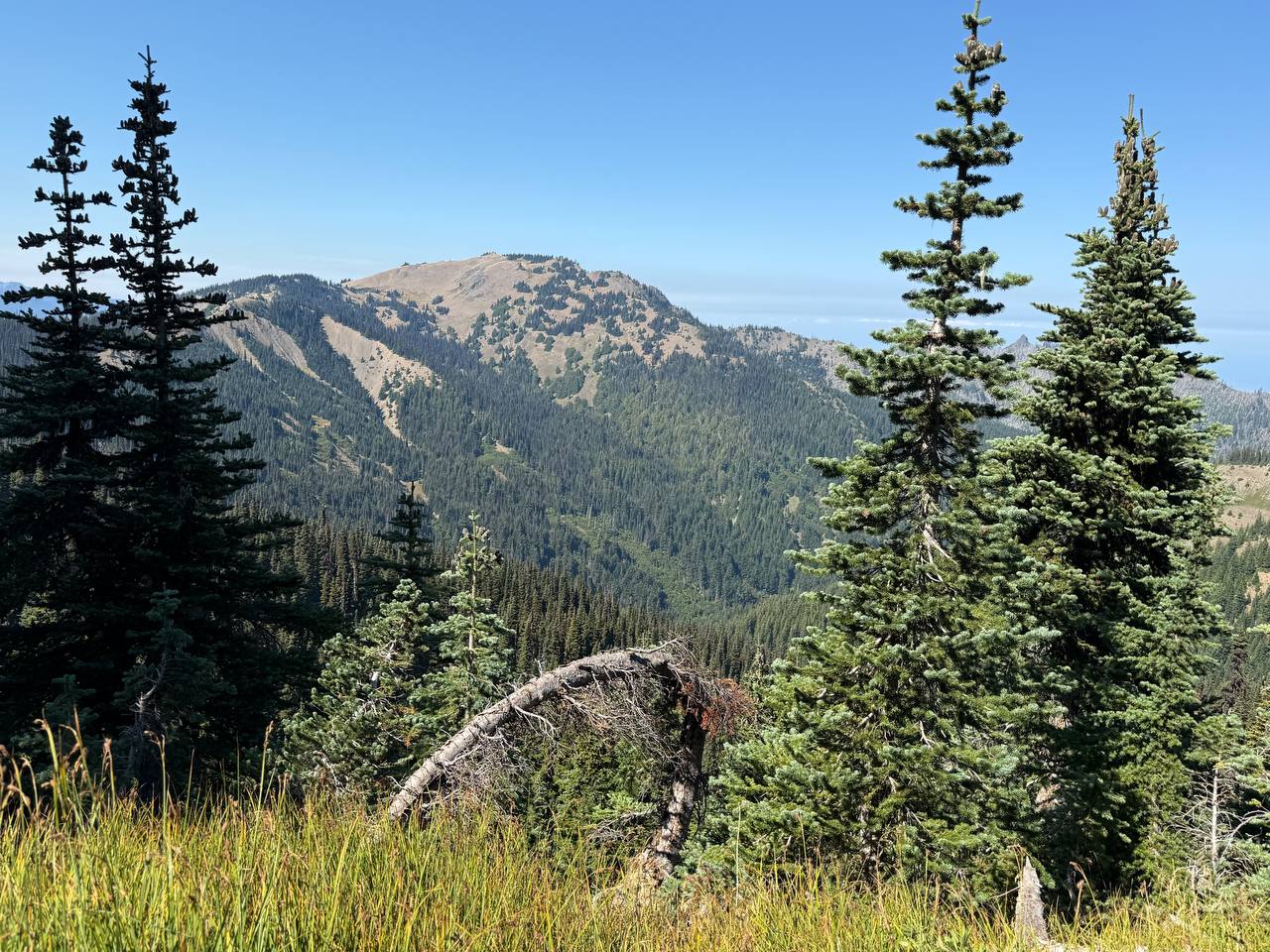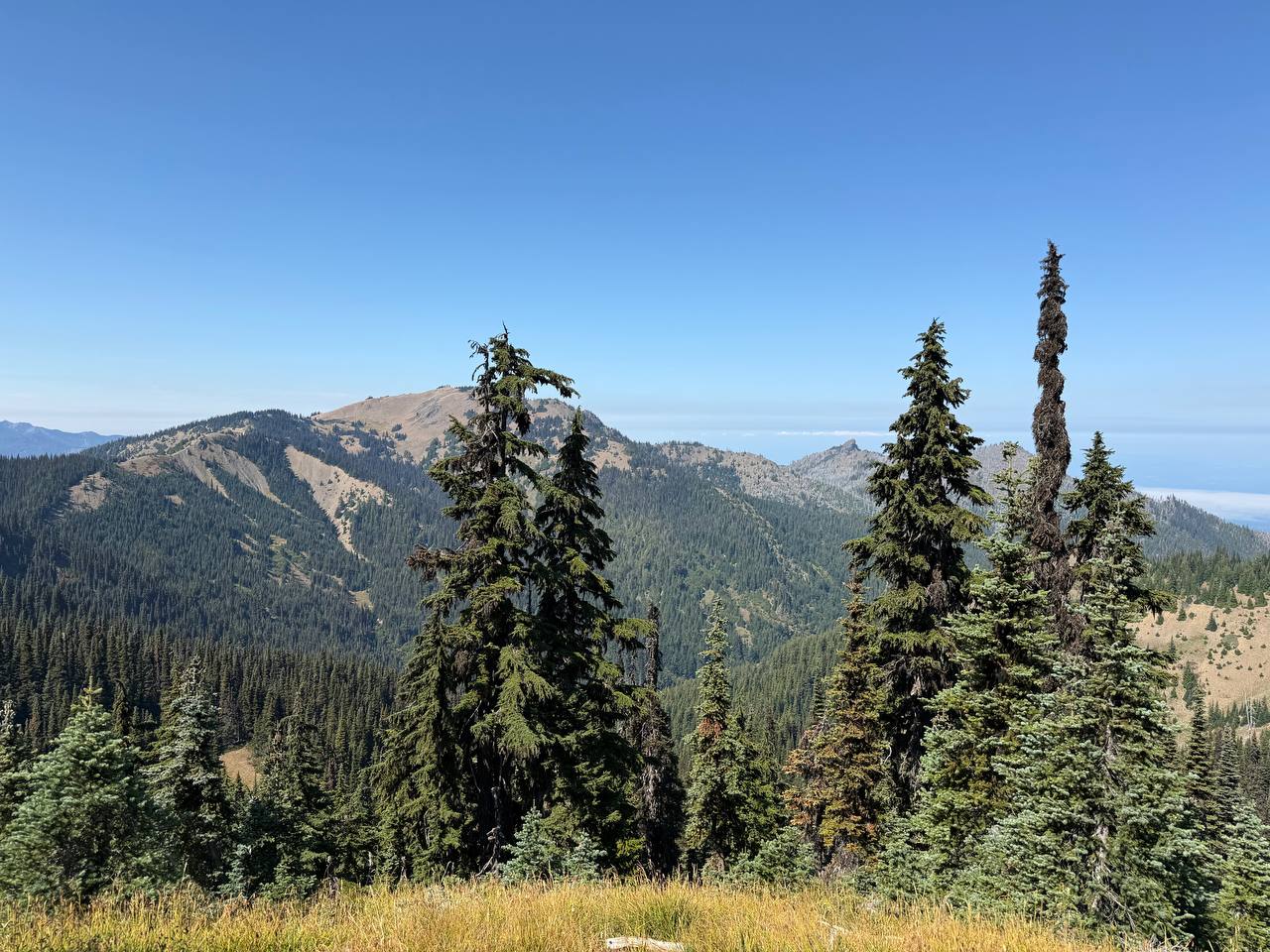 На горизонте выделяется округлая гора с пологим верхом — характерная форма для Олимпийских гор, где ледники и ветра веками сглаживали скальные пики. В промежутках между деревьями снова можно заметить тонкую белёсую полосу облаков над проливом Хуан-де-Фука, отделяющим США от Канады.