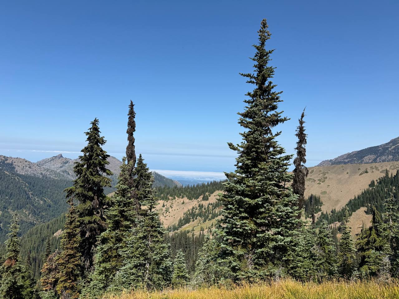 Тот же ракурс крупнее: правее — силуэты высокогорных елей, ниже — ровная белая «линиЯ» облаков. Это классическая температурная инверсия: у поверхности океана холодный, влажный воздух, выше — более тёплый и сухой. Поэтому «внизу туман, наверху солнце» — обычная картина для Hurricane Ridge в тёплый сезон. Белый настил над проливом — причина, почему из города кажется пасмурно, а на хребте — безоблачно и жарко.