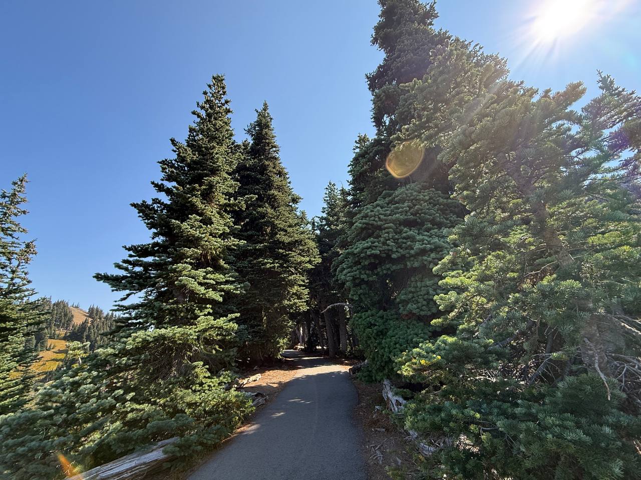 Теперь нас ждёт обратный путь. Мы возвращаемся до лыжной станции по той же дороге, что вела нас вверх, но спуск будет совсем иным по ощущениям: горы, встречавшие нас с ожиданием, теперь провожают мягким светом. У самой станции мы берём левее и продолжаем путь по укороченной дороге — по знакомому High Ridge Trail. Именно эта тропа, часть которой мы уже проходили ранее, теперь станет нашим финальным маршрутом и приведёт прямо к парковке.