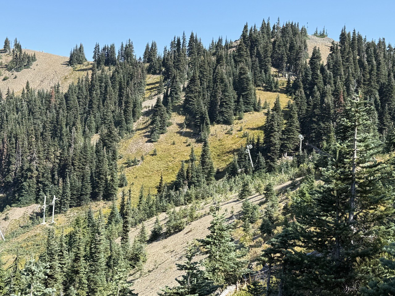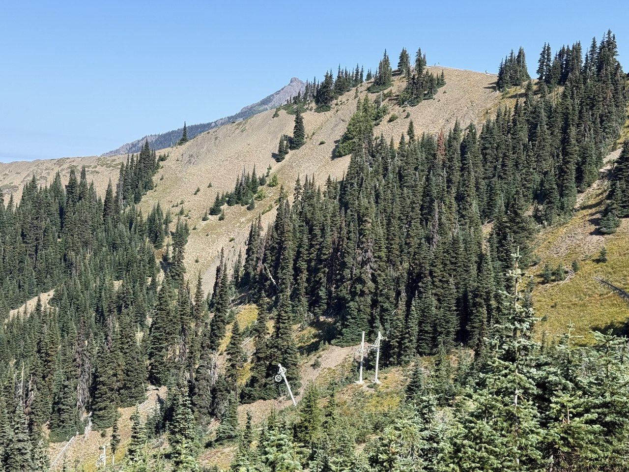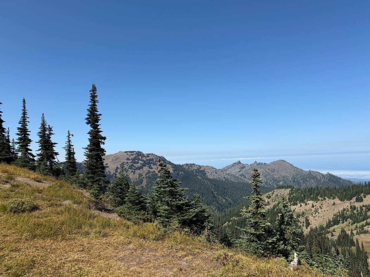 Перед вами открывается вид на знакомую тропу, которая теперь уходит назад, огибая хребет и теряясь в зелёных елях и пихтах. Этот взгляд словно подводит итог нашему подъёму: мы прошли по узкой линии гребня, поднялись на вершину Sunrise Point, вдохнули свежесть горного воздуха и увидели, как олимпийские пики уходят в голубую дымку горизонта.