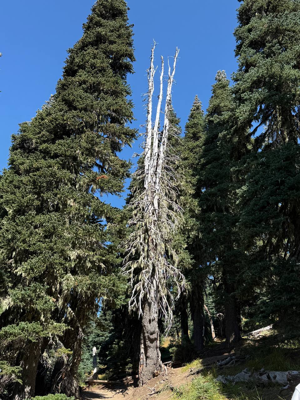Этот контраст — живая зелень и мёртвые, выцветшие стволы — делает прогулку особенно атмосферной. Он напоминает, что экосистема гор непрерывно обновляется: старое дерево становится питанием для грибов и насекомых, а рядом вырастает новое поколение.